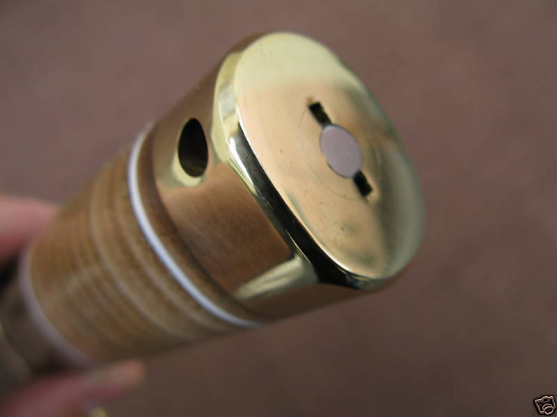 Back view, leather handle Brass butt Front of the sheath Back of the sheath