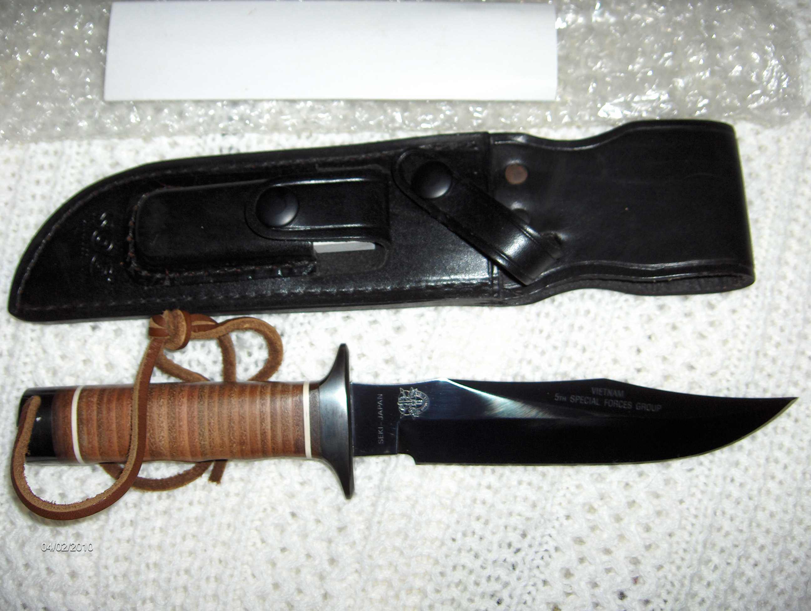 Description: Rare old production SOG S1 "5th Special Forces Group" Bowie knife for sale. Discontinued and hard to find nowadays. Comes with leather sheath & sharpening stone; no box.