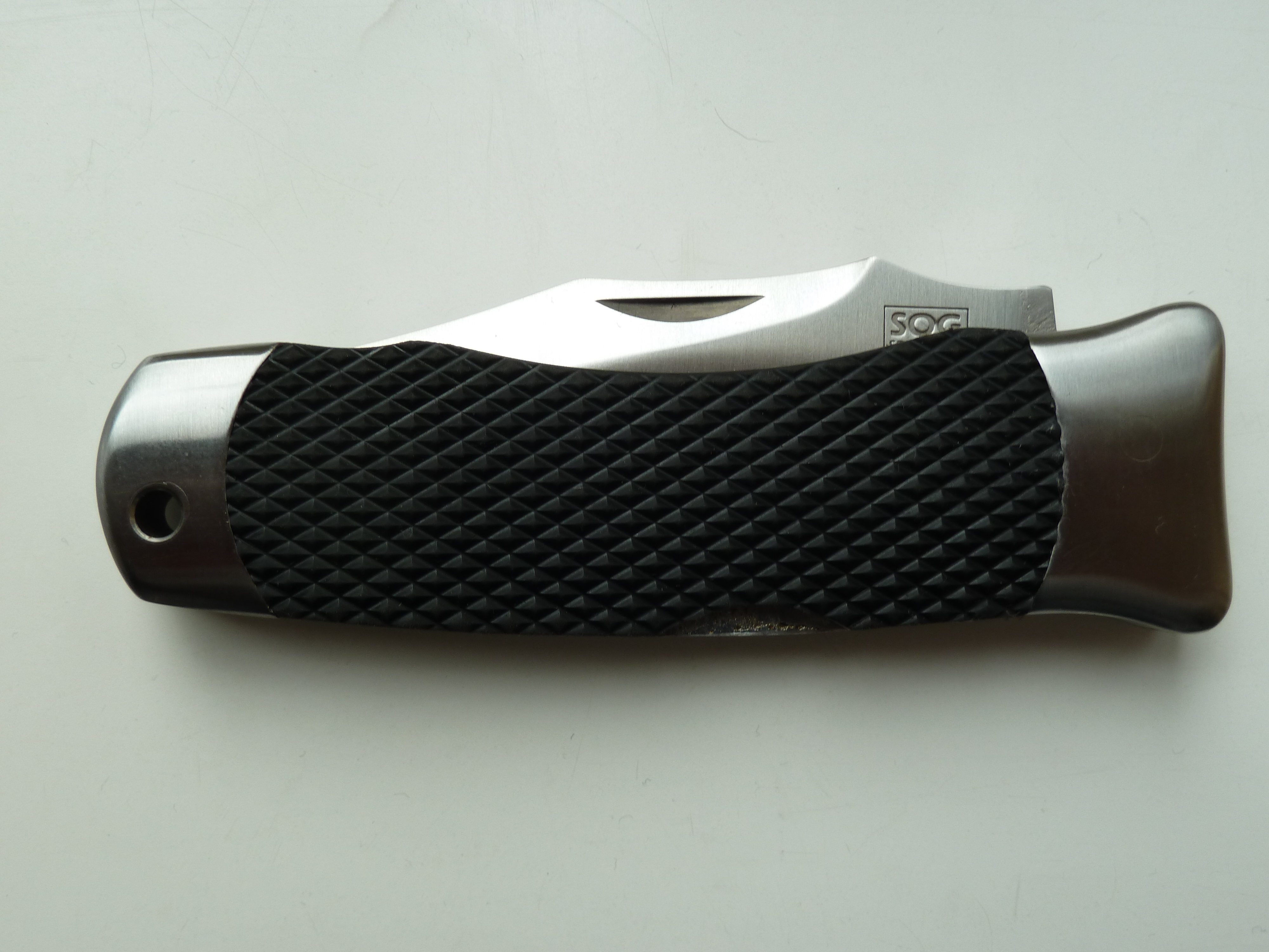 Description: I have a SOG Tomcat for sale. This is the first folding knife offered by SOG, and won "Knife of the year" in 1988, the year I bought it. This knife has been only lightly used and carried. There are no visual or operational defects, it is in excellent shape. I am a professional knifemaker, and have only lightly sharpened this knife by touching it up on a ceramic rod. It really hasn't needed to be sharpened. I do not have the original box or sheath. Locking mechanism is perfect and solid, the best I have ever seen on a folding knife. There is absolutely no play in the joint. The rubber scales show almost no wear.